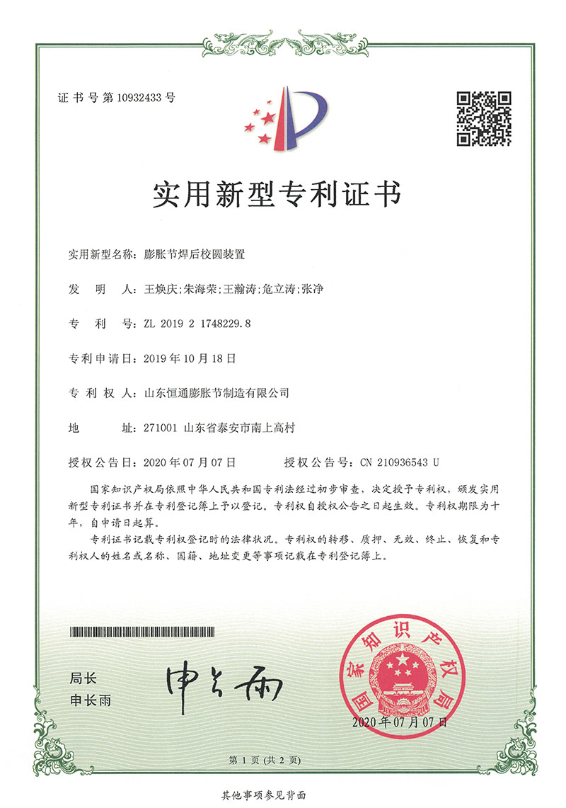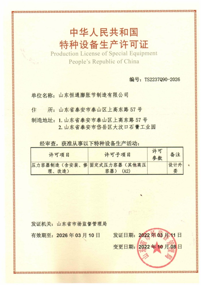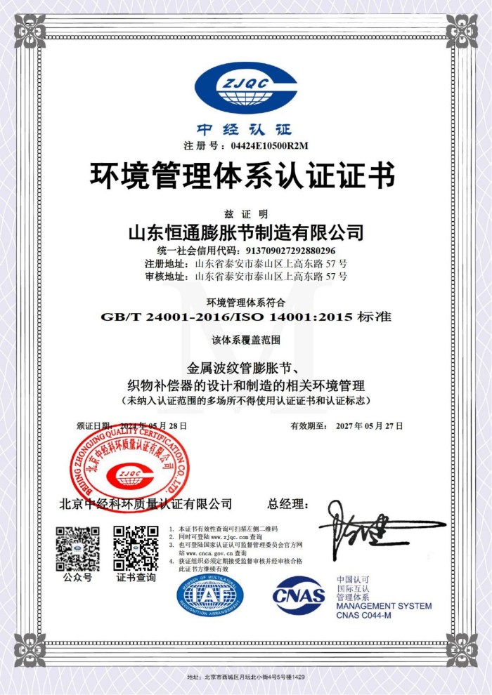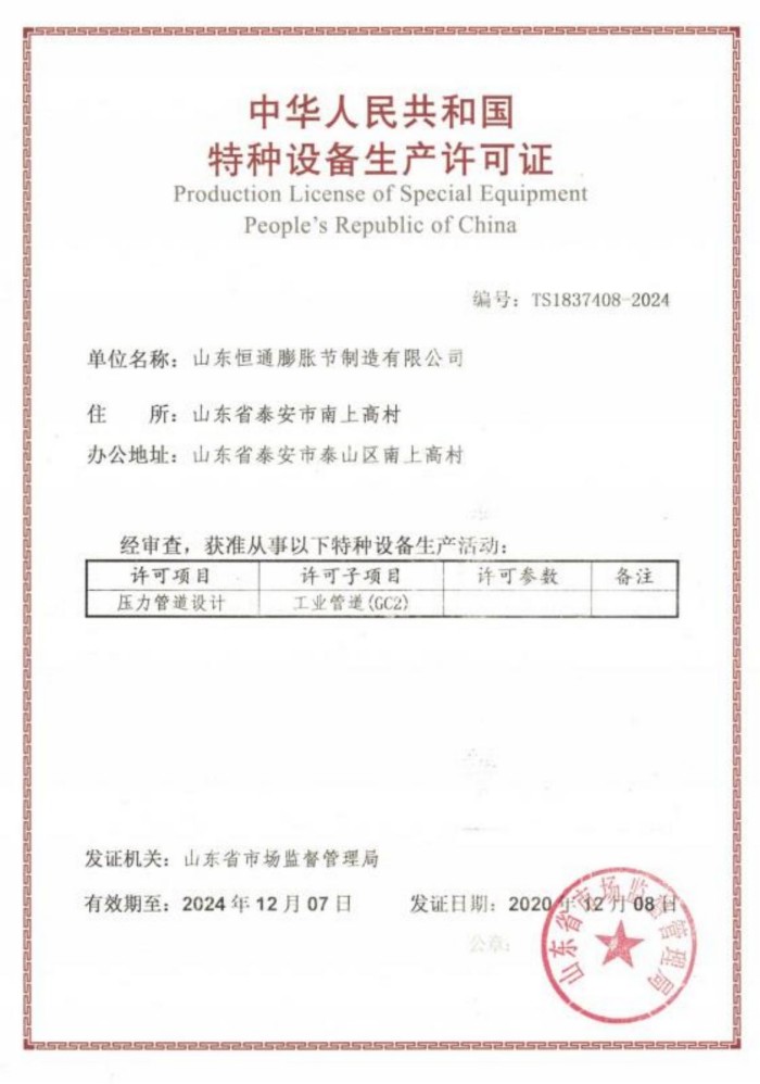 公司取得我國特種設(shè)備制造許可證、壓力容器A1級資質(zhì)、壓力管道元件A、B的資質(zhì),并且獲得了歐盟PED-CE認證、美國ASME“U”鋼印、ISO 9000質(zhì)量管理體系認證、GB/T 14000 環(huán)境管理體系認證及GB/T 45000 職業(yè)健康安全體系認證。膨脹節(jié)產(chǎn)品涵蓋壓力管道波紋膨脹節(jié)、壓力容器波形膨脹節(jié)、金屬波紋管、金屬軟管、聚四氟補償器、橡膠補償器及非金屬補償器等。
